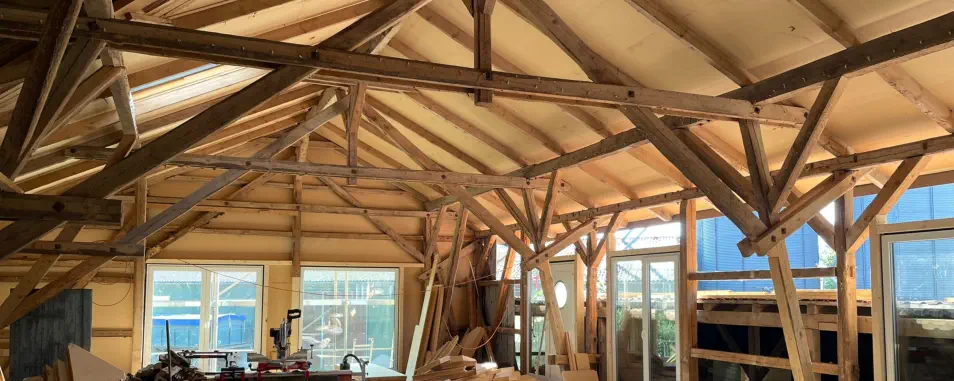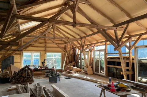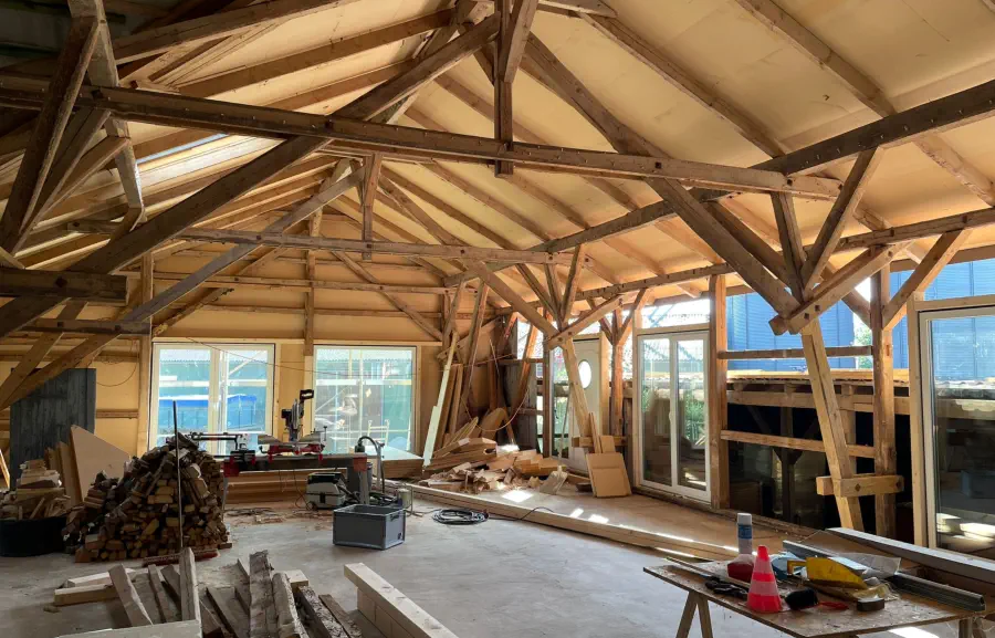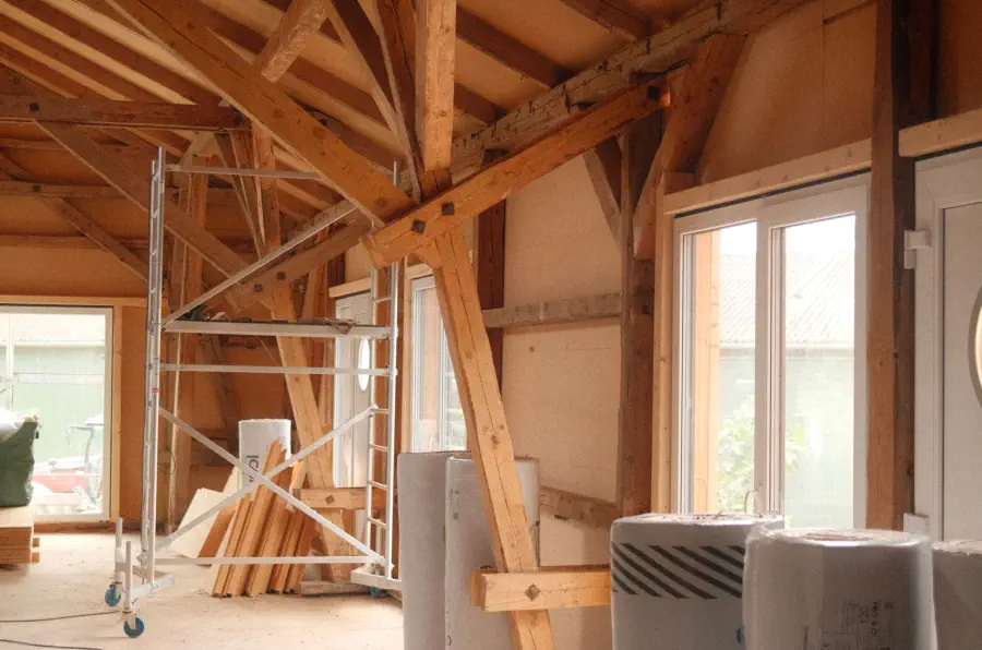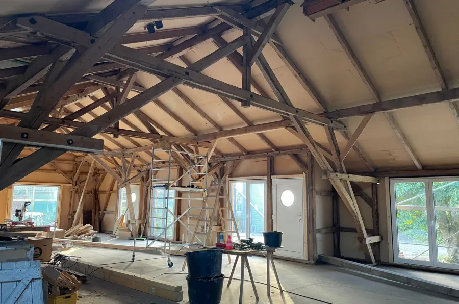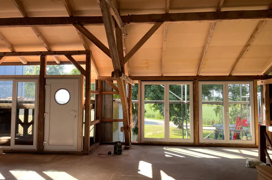 Die ursprüngliche Hofscheune wird seit 2024 Schritt für Schritt zu neuem Leben erweckt. Alte Holzbalken bleiben sichtbar und treffen auf moderne Architektur, Glasfaser-Internet und hochwertige Ausstattung. Schon heute kannst du einen Blick hinter die Kulissen werfen – und dir einen Platz auf unserer Warteliste sichern.