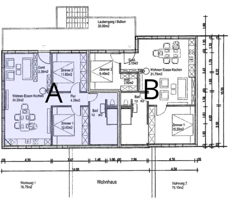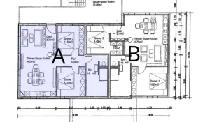 Wohnung B70 m², zwei Schlafzimmer, ein modernes Bad mit Dusche & Wanne. Balkon mit Blick auf den Hof und ganz viel Licht.